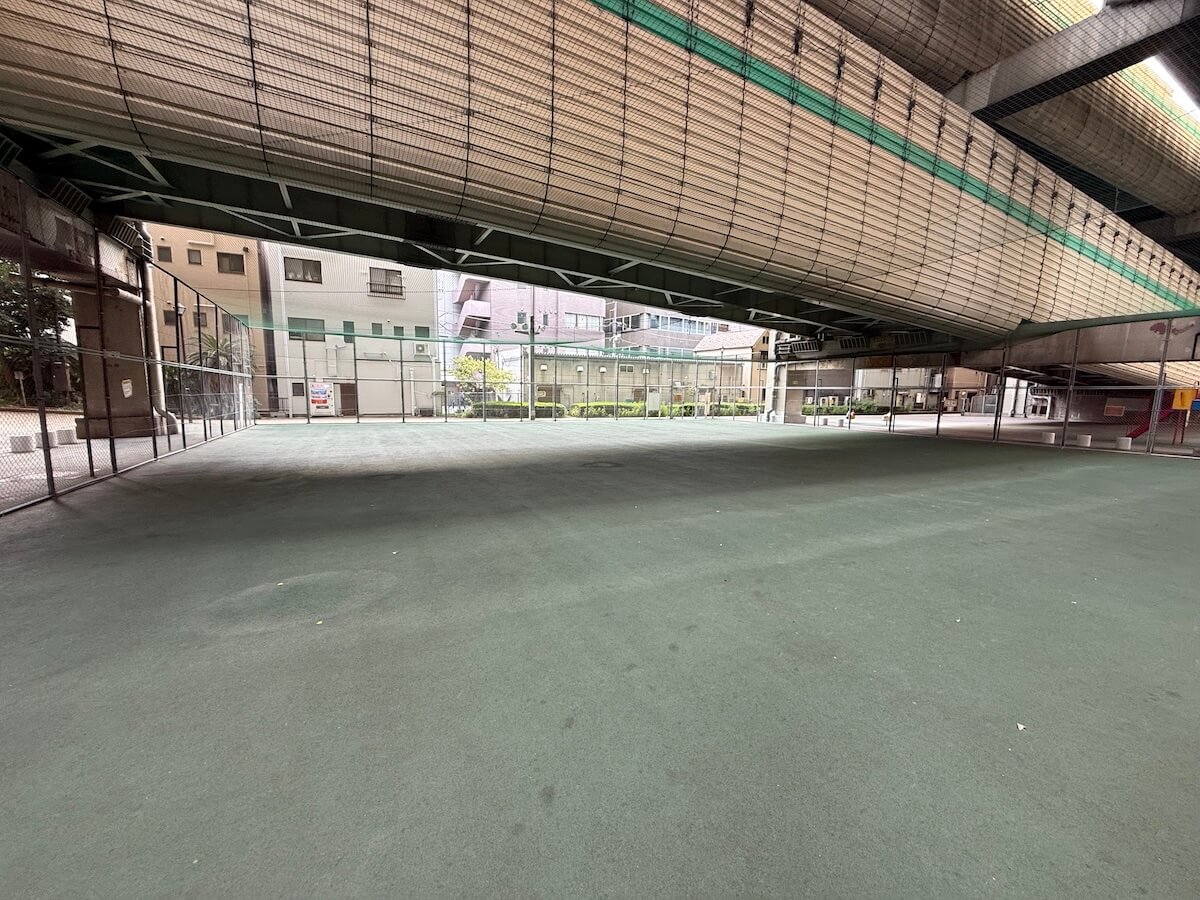 箱崎川第二公園は、首都高速の高架下に設けられた都市型のキャッチボール場です。地面は舗装面で、約650㎡のコンパクトな広さがあります。周囲はフェンスやネットで囲まれており、ありも整っています。屋根があるため天候の影響を受けにくく、日中も明るく過ごしやすい環境です。